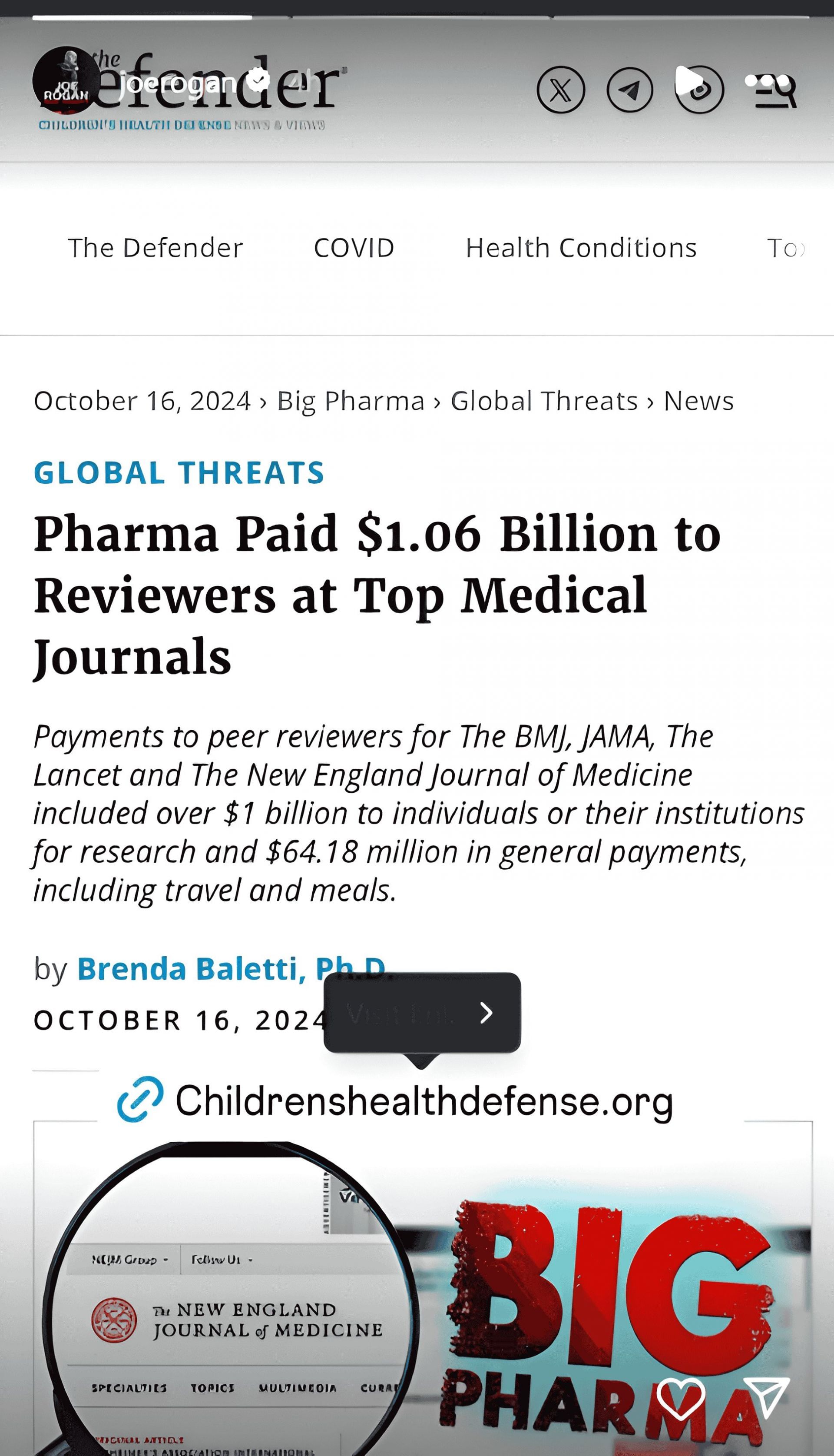 Rogan's Instagram story highlighted the aforementioned report, which noted that more than half of the two thousand examined peer reviewers received payments from noted pharmaceutical industries.