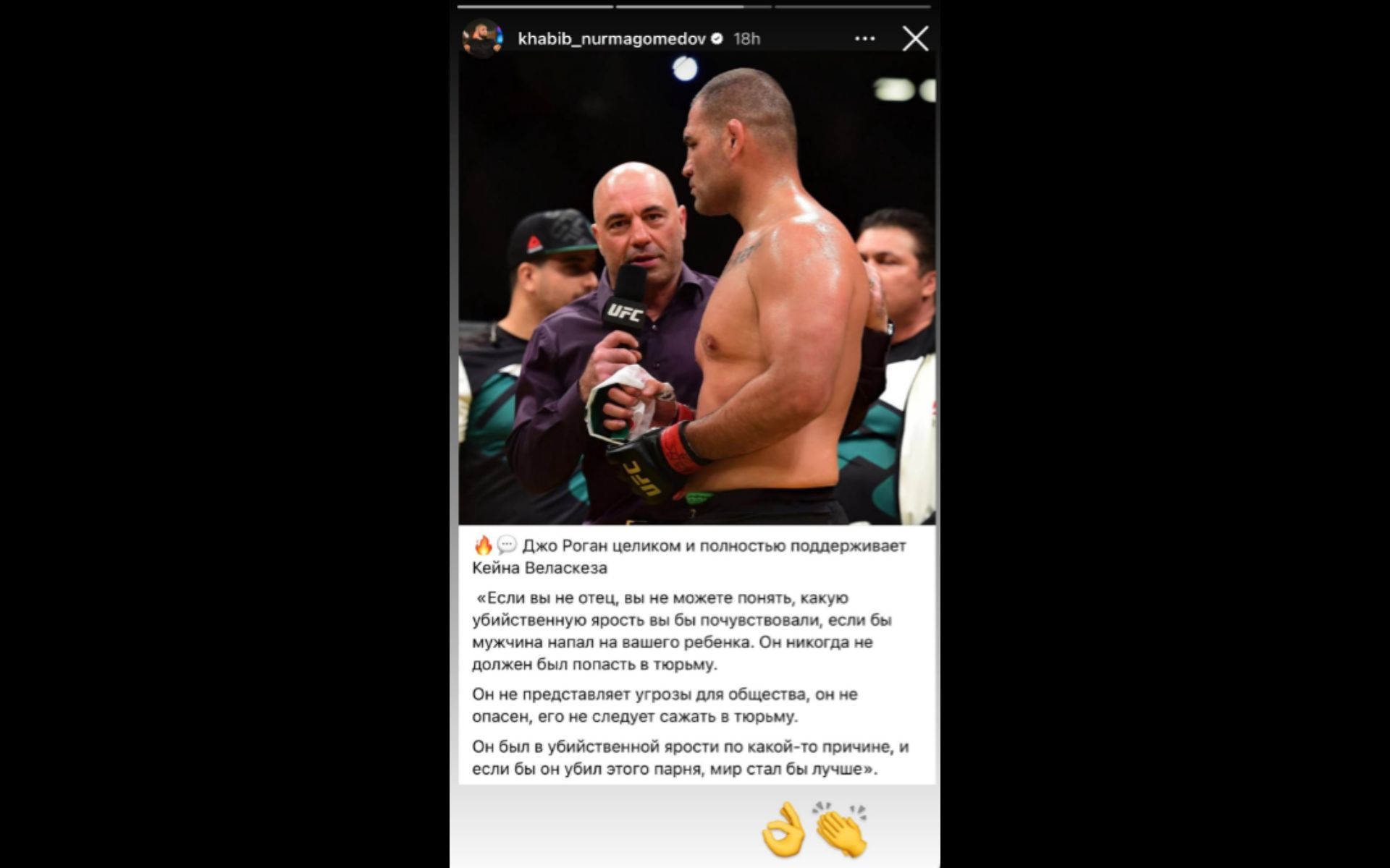Khabib Nurmagomedov recently shared his support for Cain Velasquez yet again by sharing Joe Rogan's defense of the American on his Instagram story. Velasquez was recently sentenced to a five-year prison for shooting a person who had been accused of molesting his four-year-old son.