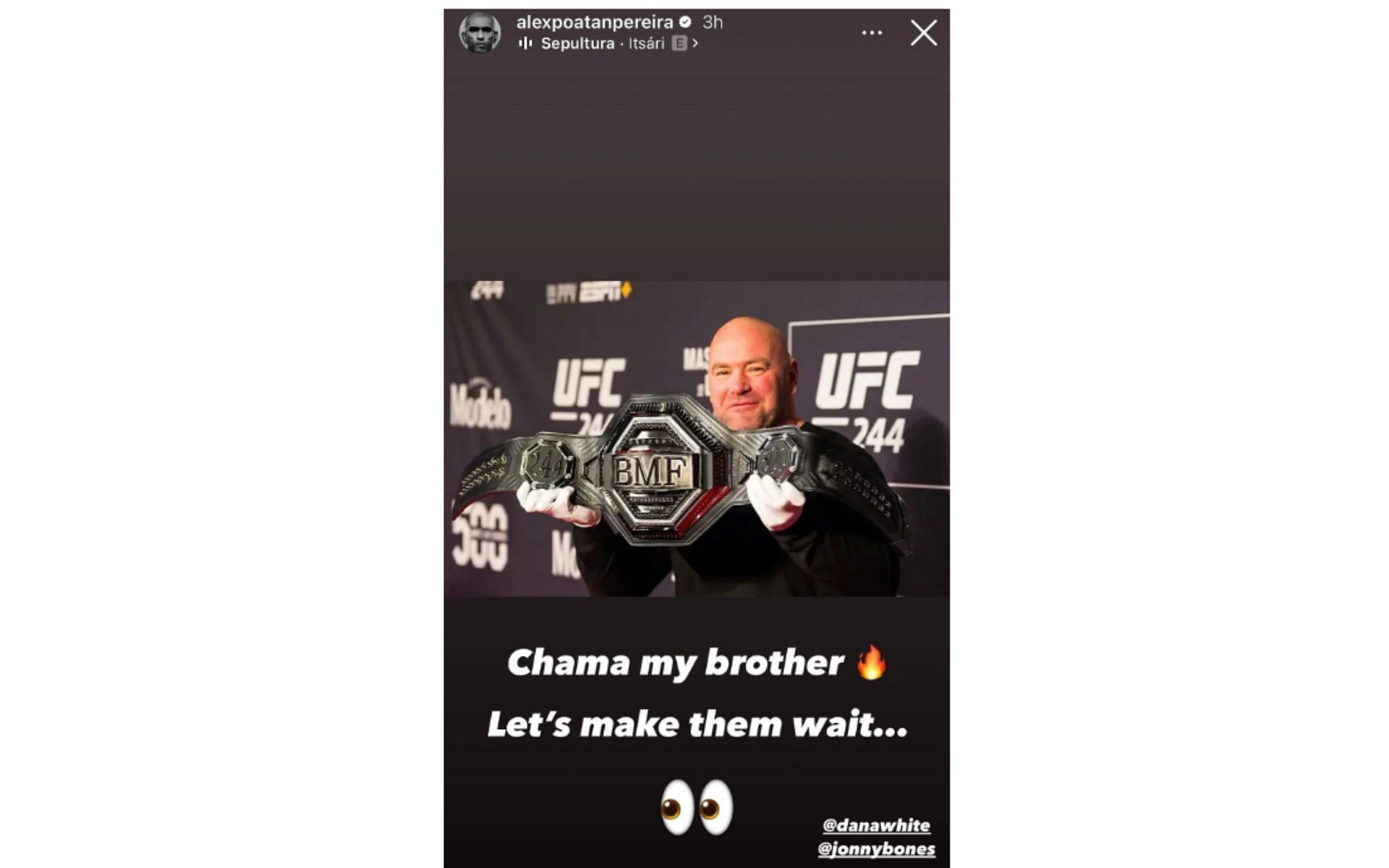 This prompted a reaction from Pereira, who looks open to Jones' proposition for a BMF title fight. The reigning light heavyweight champion recently posted an Instagram story of UFC CEO Dana White holding the BMF belt while tagging both White and Jones. He wrote: