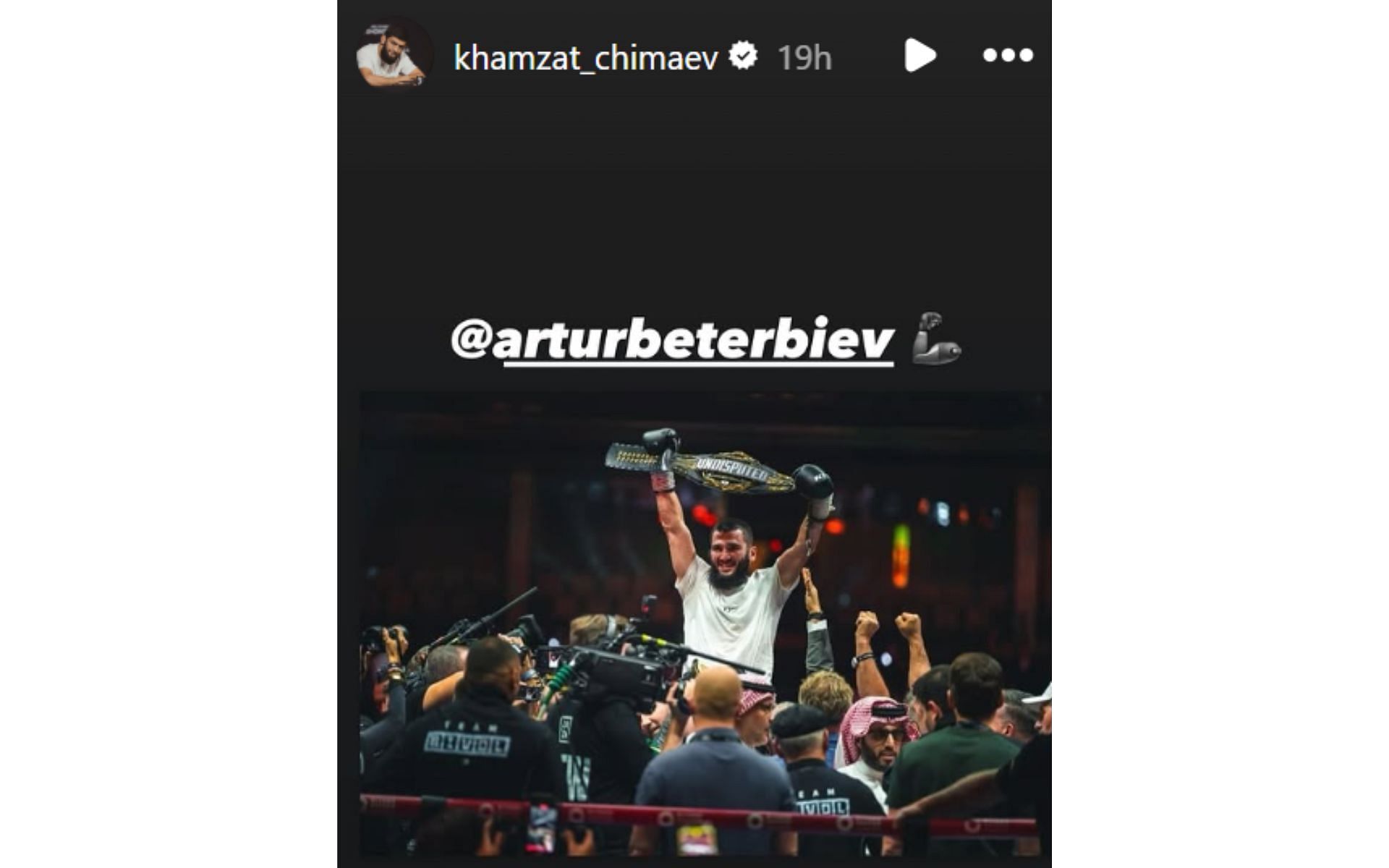 Chimaev recently took to Instagram to show support for a champion in a different sport. 'Borz' shared a post of undisputed boxing light heavyweight champion Artur Beterbiev to his Instagram story and captioned it: