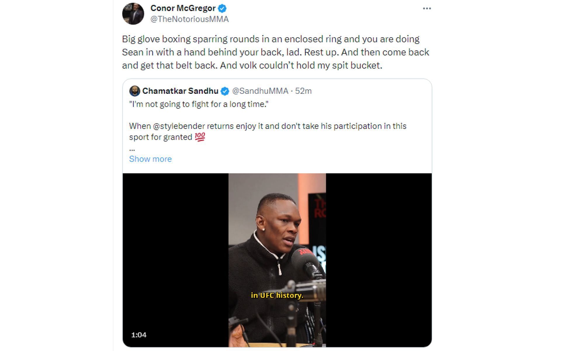"Big glove boxing sparring rounds in an enclosed ring and you are doing Sean in with a hand behind your back, lad. Rest up. And then come back and get that belt back. And volk couldn’t hold my spit bucket."
