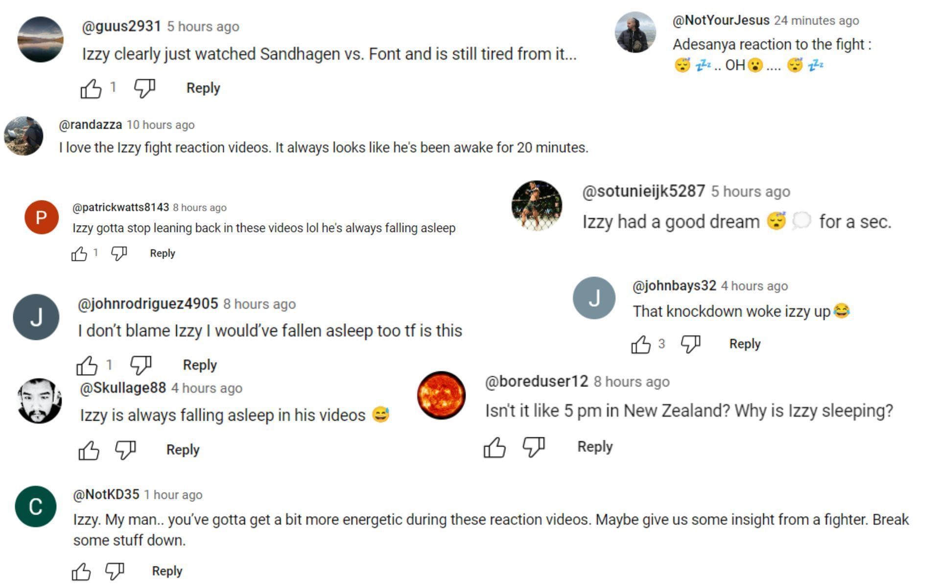 "Izzy. My man.. you’ve gotta get a bit more energetic during these reaction videos. Maybe give us some insight from a fighter'[s] [perspective]. Break some stuff down."