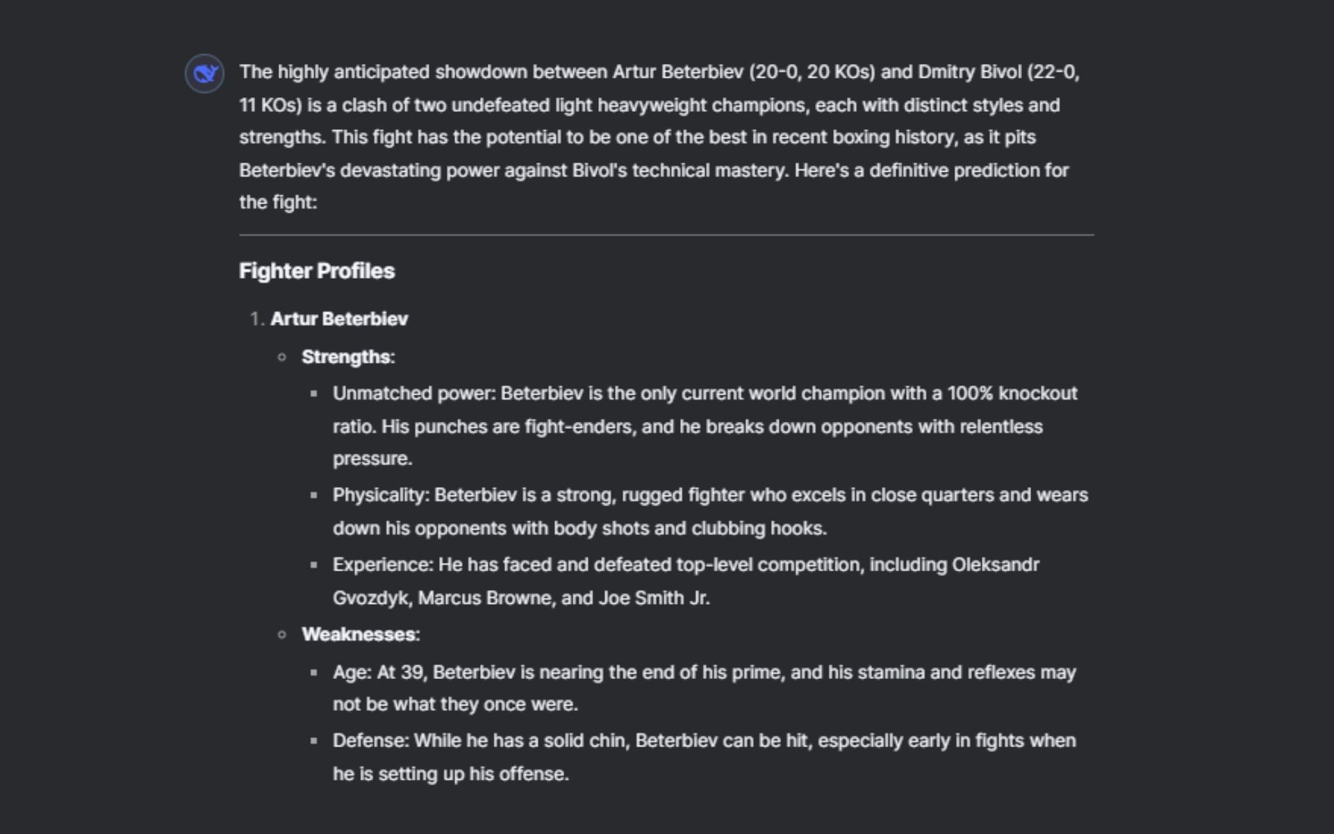 The prediction then broke down the intriguing stylistic clash. Regarding Beterbiev's approach, it indicated that he'll attempt to get close, connect with hard shots to the body and head, and break and drag Bivol into a firefight.