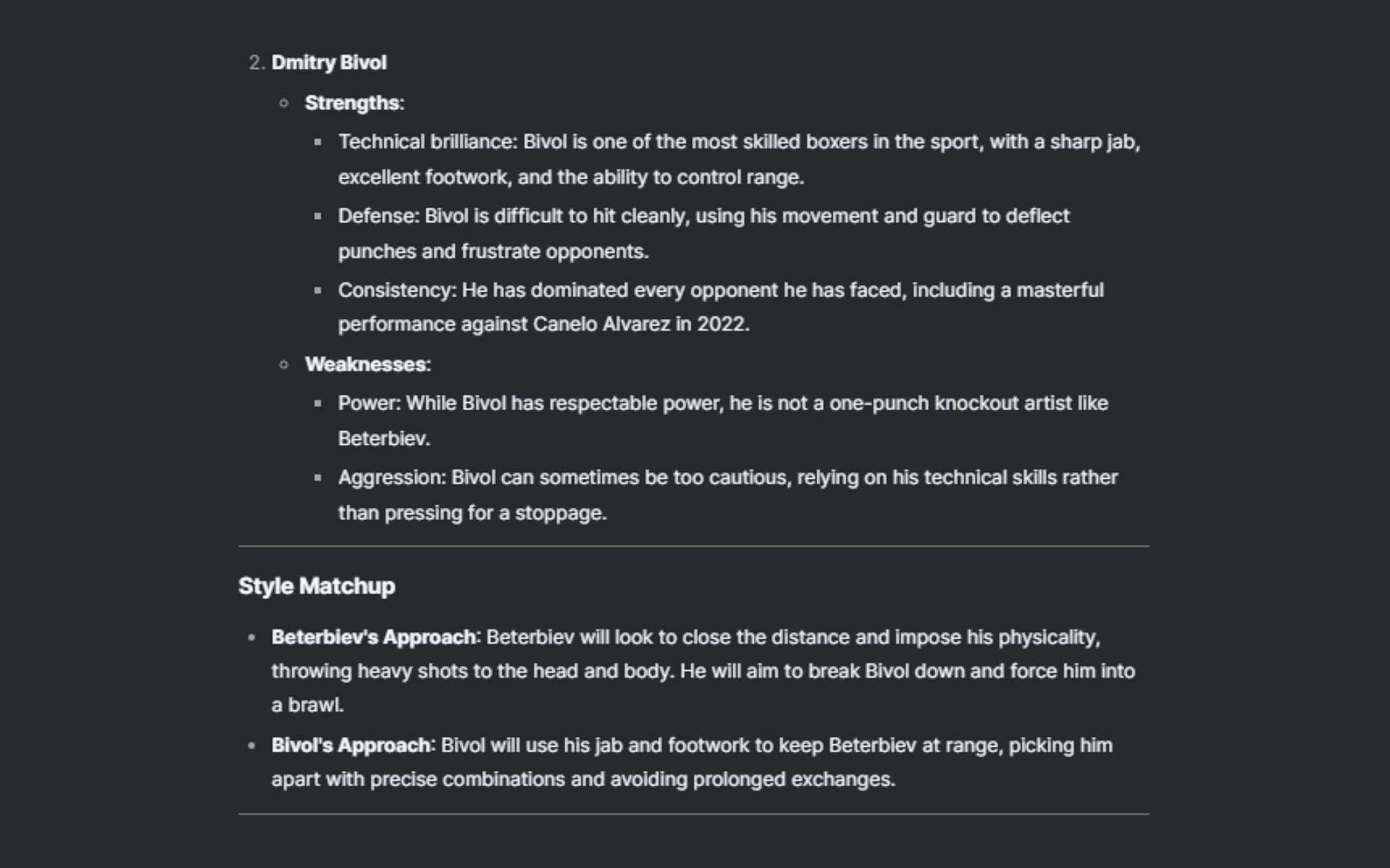 Dmitry Bivol's strengths were noted to be his technical brilliance, defense, and consistency. He has great footwork, a stinging jab, and is deft at controlling range. He's also elusive with his movement and uses his guard well. He's also dominated nearly all foes, including boxing megastar Canelo Alvarez whom he beat in 2022.
