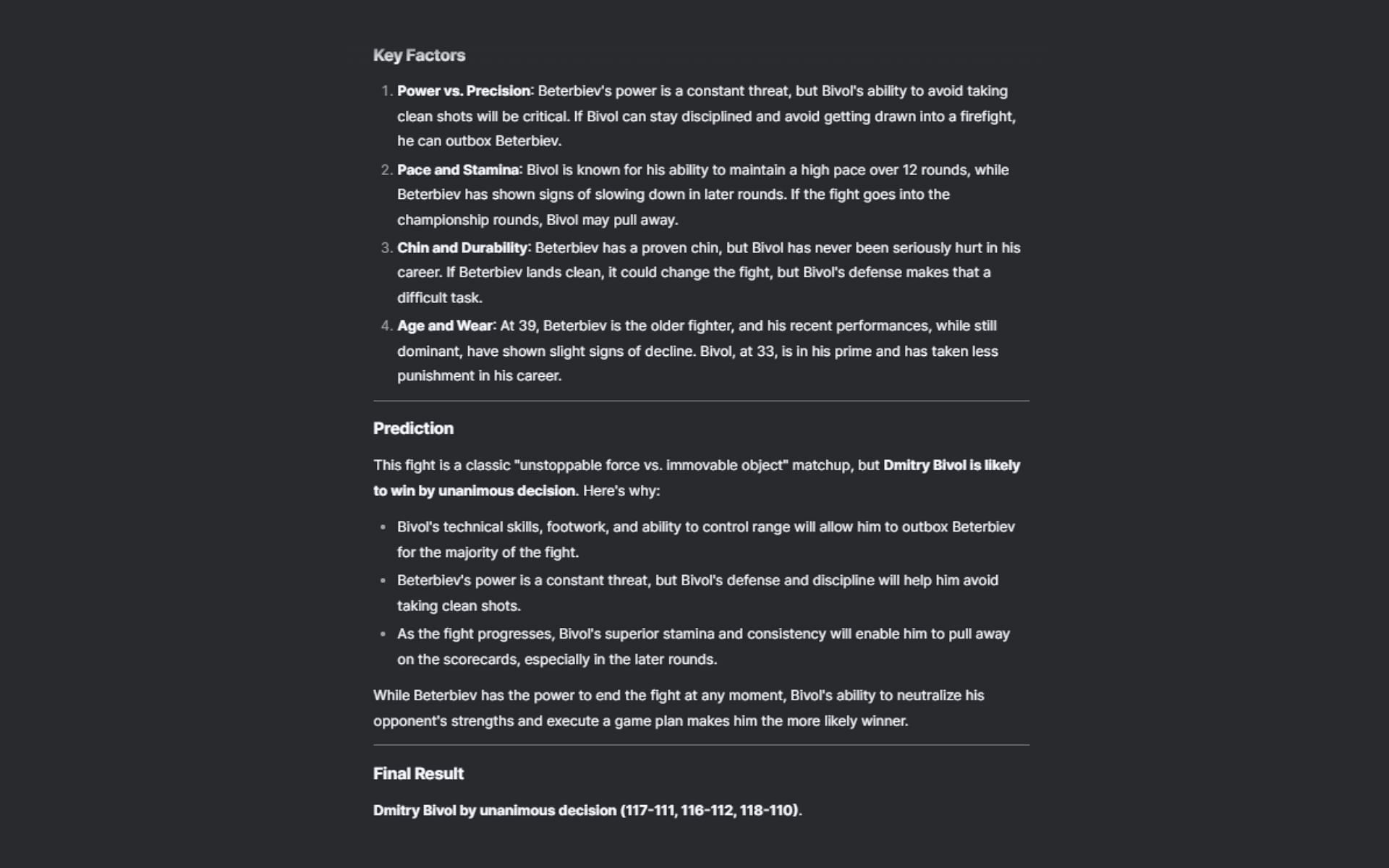 The prediction acknowledged that it'd be a close fight, but Dmitry Bivol would win via unanimous decision -- mainly because his superior technique would help him outbox Artur Beterbiev, his defense would help him evade Beterbiev's powerful strikes, and his greater stamina would help him pull away in the later rounds.
