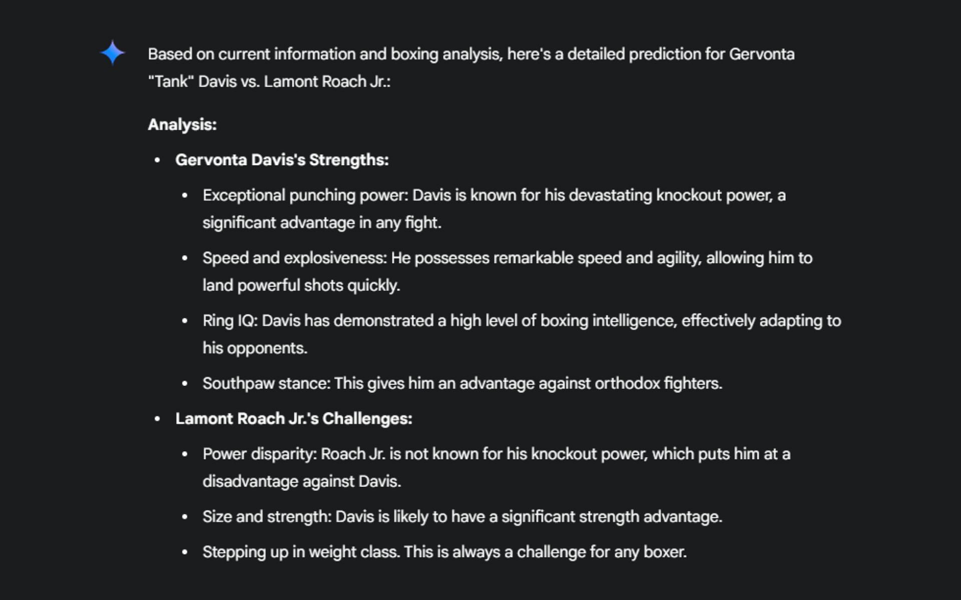 Considering the pertinent information, the prediction entailed a list of Davis' strengths and Roach Jr.'s challenges in their showdown. Davis' strengths were deemed to be his extraordinary punching power, explosiveness and speed, ring IQ, and his habit of primarily fighting from the southpaw stance.