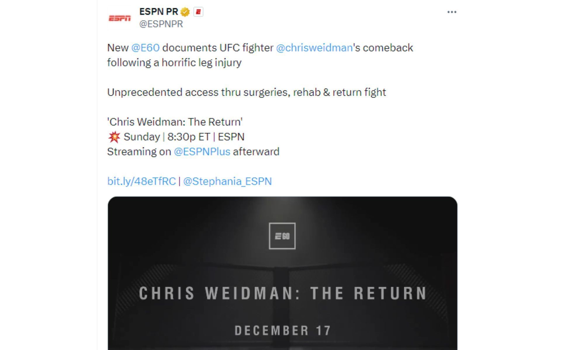 MMA fans will now get a behind-the-scenes look into the lengthy rehab and the former UFC middleweight champion's inspiring return to the octagon. ESPN announced that the E60 documentary titled 'Chris Weidman: The Return' will air on the network this Sunday, December 17th, at 8:30 pm ET and will then be available to stream on ESPN+.