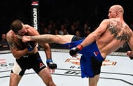 In his latest masterpiece – a two round drubbing of former 155 champ Antony Pettis, Holloway showcased a low lead push kick he used to keep “Showtime” from setting properly to launch his kicks, before trapping Pettis on the cage and beating the brakes off of him en route to the first TKO loss of Pettis’ career.