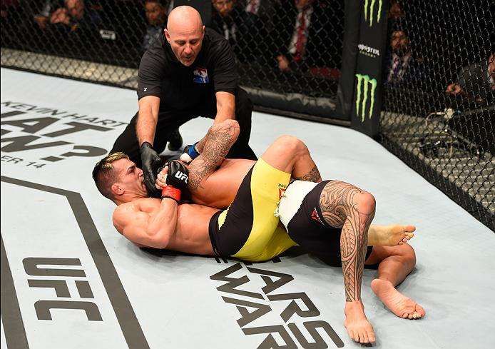 Bisping started off the round on a cautious note and maintained his distance early on in the round one. Henderson missed several ‘H-Bombs’ but managed to drop Bisping after connecting one. Bisping somehow miraculously managed to survive Henderson’s hammerfists and elbows.