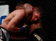However, in his 205 matchup against Woodley, Wonderboy got taken down after T-Wood managed to parry the karateka’s slapping kick, caught the leg and muscled the lanky WW to the mat. The fight remained on the mat for the rest of the first round, with Woodley busting him open using slick elbows from top position.