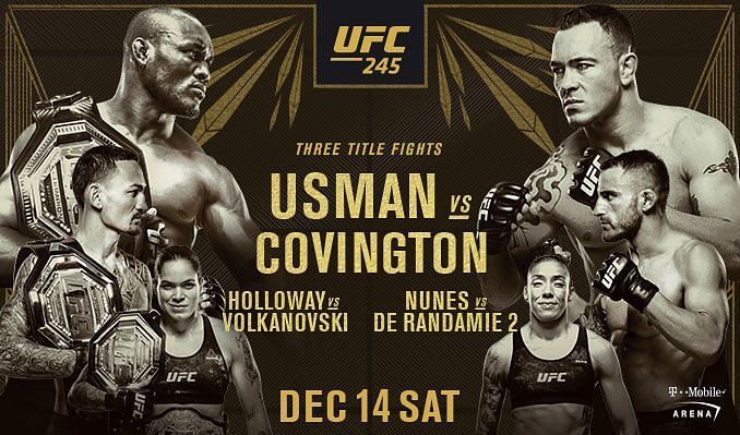 UFC 245: Usman vs. Covington is an upcoming MMA event produced by UFC that is going to be held on December 14, 2019 at T-Mobile Arena in Paradise, Nevada, United States.
