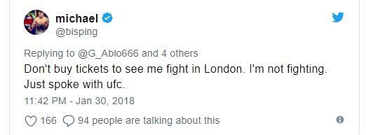 After a long while, the UFC fans in the UK will have a headlining UFC Fight night event on March 17 to be held at the O2 arena in London. Fight fans all around the world expected that Michael Bisping will draw curtains to his illustrious career in the main event. But in a tweet, the former champion has declined that he will be competing in London.