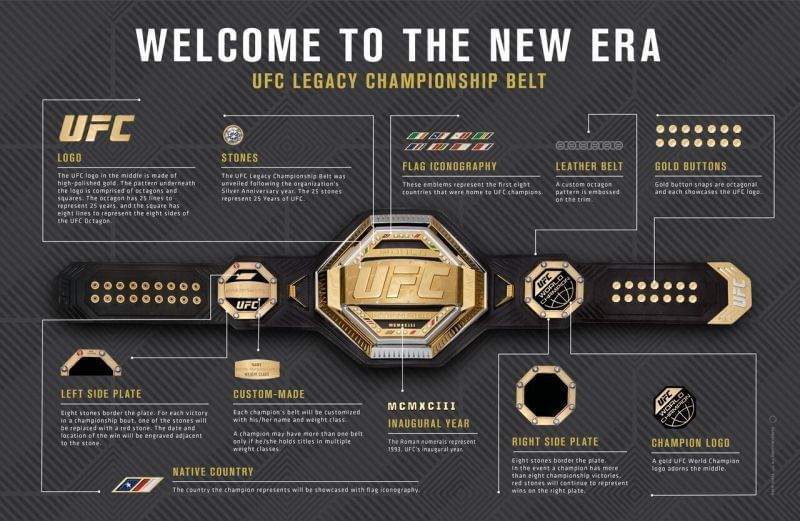 “This Saturday begins a new era for UFC, and it’s a perfect time to unveil our new UFC Legacy Championship Belt,” UFC President Dana White said. “The belt honors UFC’s past, while recognizing the amazing accomplishments of our current champions.”