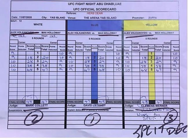 The general belief among the fans is that Max Holloway won the first two rounds and Alexander Volkanovski won the final two rounds. And the third round was the topic of argument. However, as per the judges' scorecard, all three judges gave the third round to Alexander Volkanovski. And it was the fifth round that decided the winner of the fight.