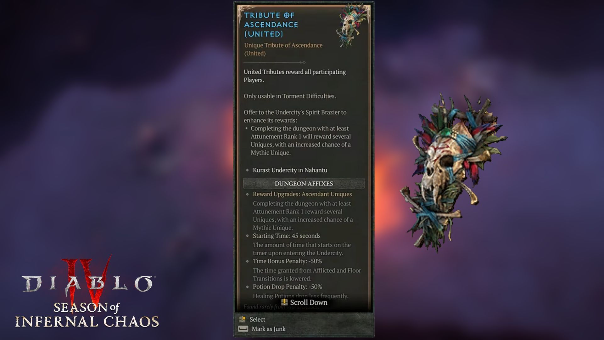 This item must be offered to the Spirit Brazier at the beginning of every dungeon run and significantly increases the chance of acquiring multiple Unique items, as well as a Mythic item. While the rewards are high, using the Tribute of Ascendance increases the challenge of the dungeon itself.