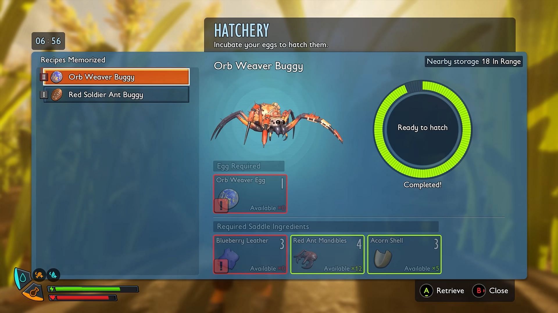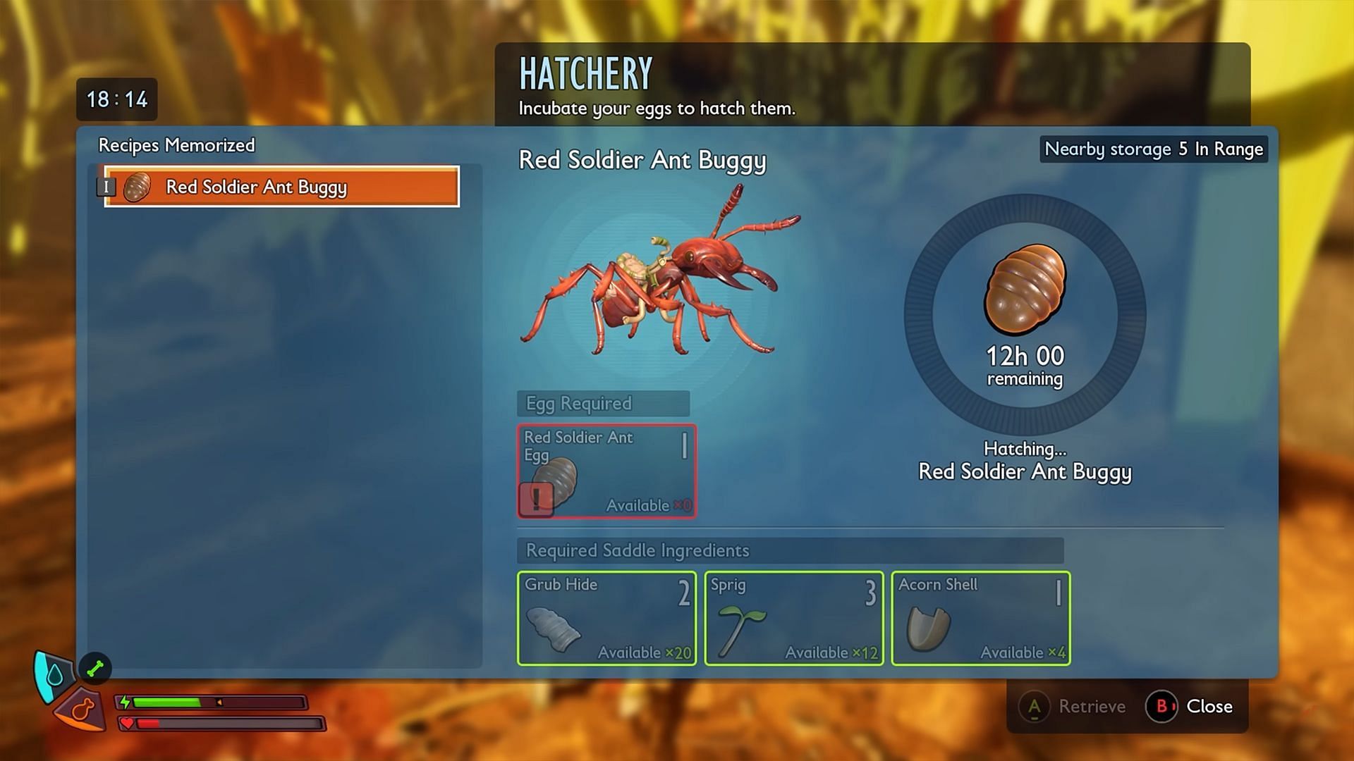 Once the Egg has been acquired, place it in the Hatchery and wait for 12 in-game hours. Then, return to your Hatchery and hatch the Egg to get yourself a new Red Soldier Ant Buggy.