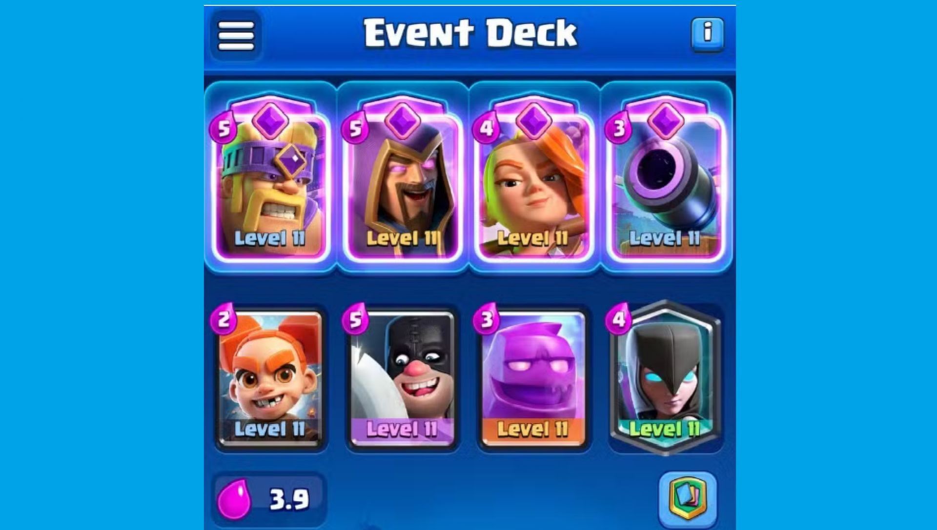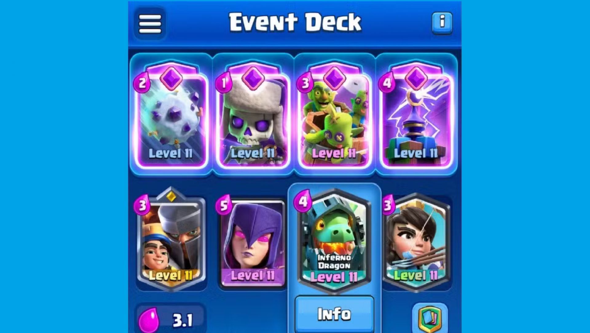 The average Elixir Cost for this Clash Royale Evolution Mayhem event deck is 3.5.