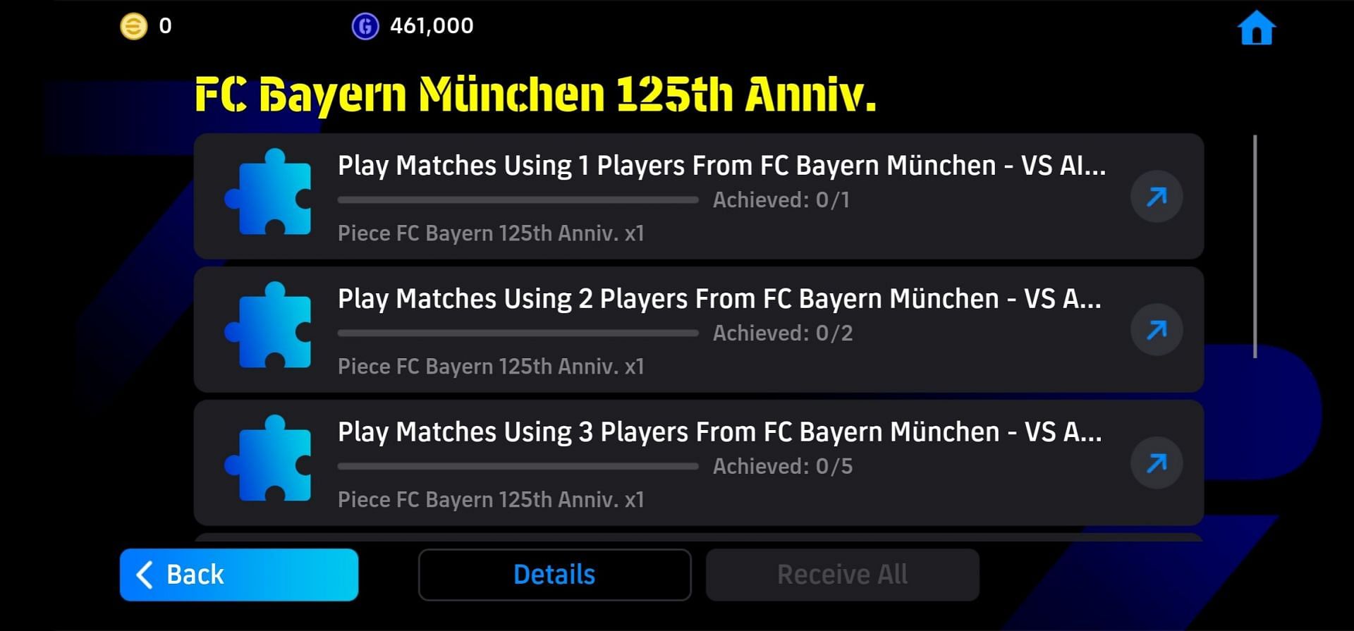 Throughout the campaign, players can collect FC Bayern 125th Anniversary Pieces by participating in special events and completing Objectives. Gathering all of them reveals the picture of Bayern's home ground, the Allianz Arena, commemorating the club’s achievements.