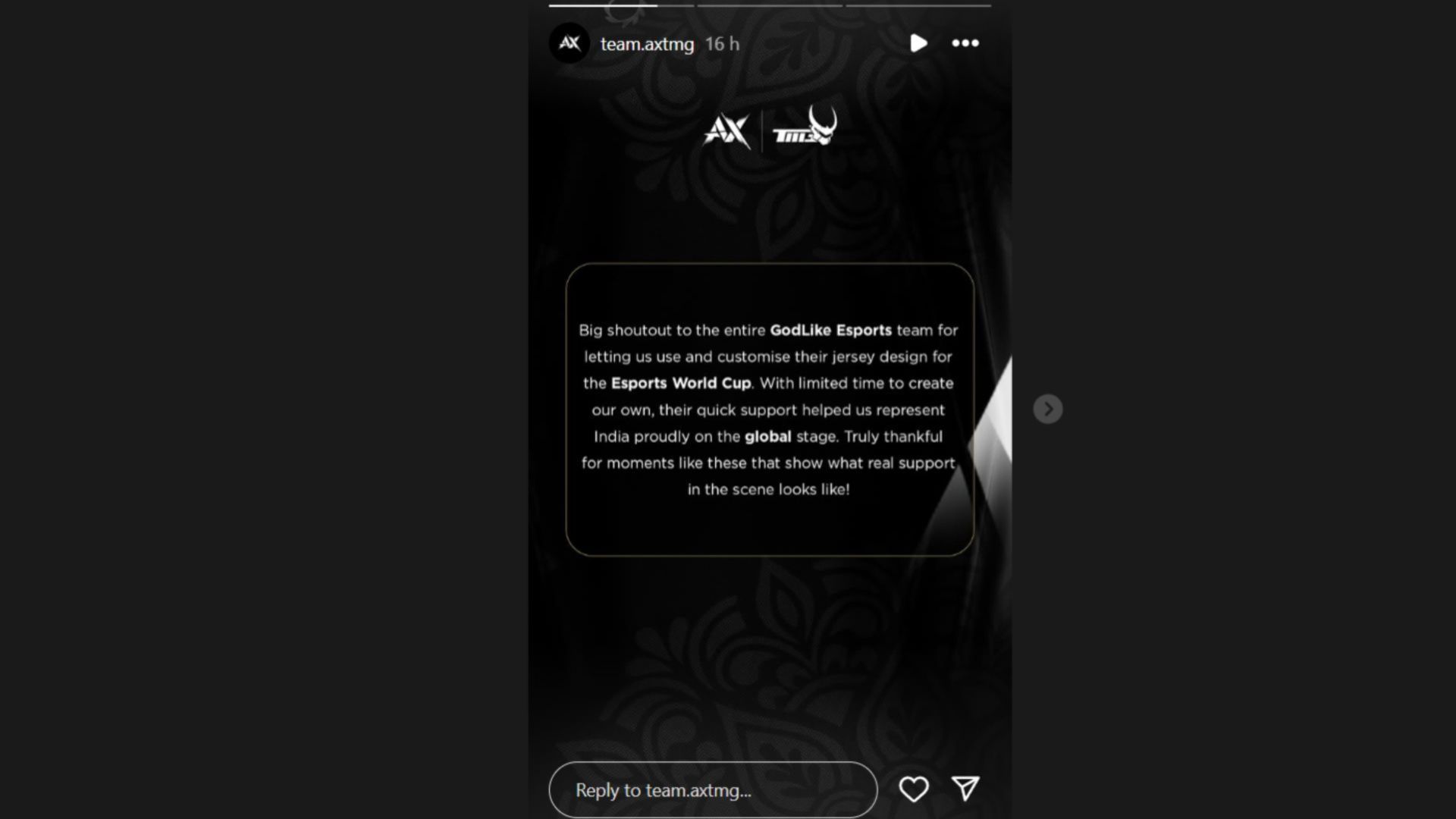 "Big shoutout to the entire GodLike Esports team for letting us use and customize their jersey design for the PUBG Mobile World Cup. With limited time to create our own, their quick support helped us represent India proudly on the global stage. Truly thankful for moments like these that show what real support in the scene looks like."