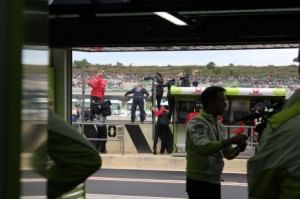 From the racing box: The Pramac Racing Team look on in horror as Jorge Lorenzo has a horrific high-side crash. Lorenzo had a lucky escape