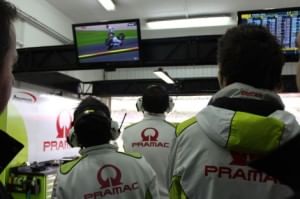 From the racing box: The Pramac Racing Team wraps up as the Honda team gets ready to celebrate outside.