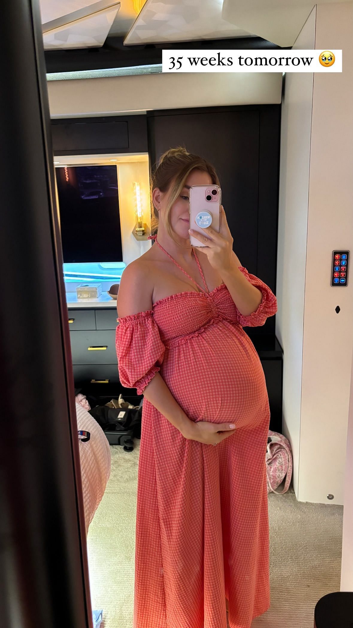 On Sunday, April 28, Fish shared a pregnancy milestone on her Instagram story. Her look featured a gingham maxi dress with off-shoulder puffed sleeves. She captioned the story: