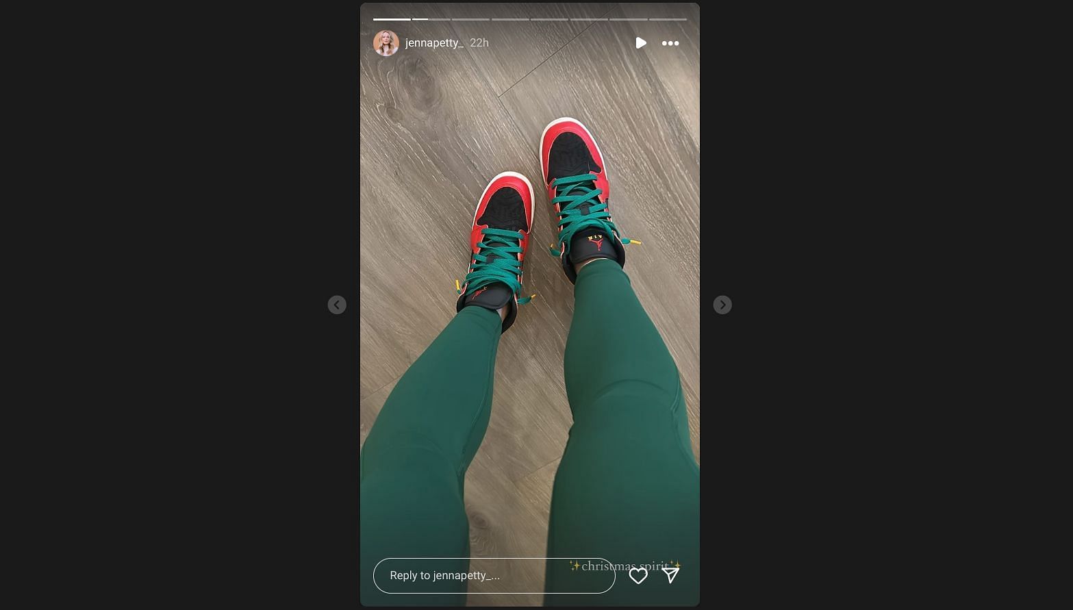 Jenna dressed up for the day in a Christmas color-coded outfit. She uploaded a picture of her sweatpants and shoes.