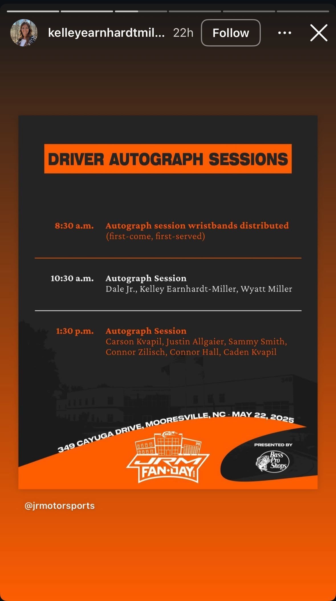 On May 22nd, the JR Motorsports racing organization will be hosting a day just for its fans at their headquarters in Mooresville, North Carolina, and Kelley Earnhardt shared a schedule for the drivers' autograph session.