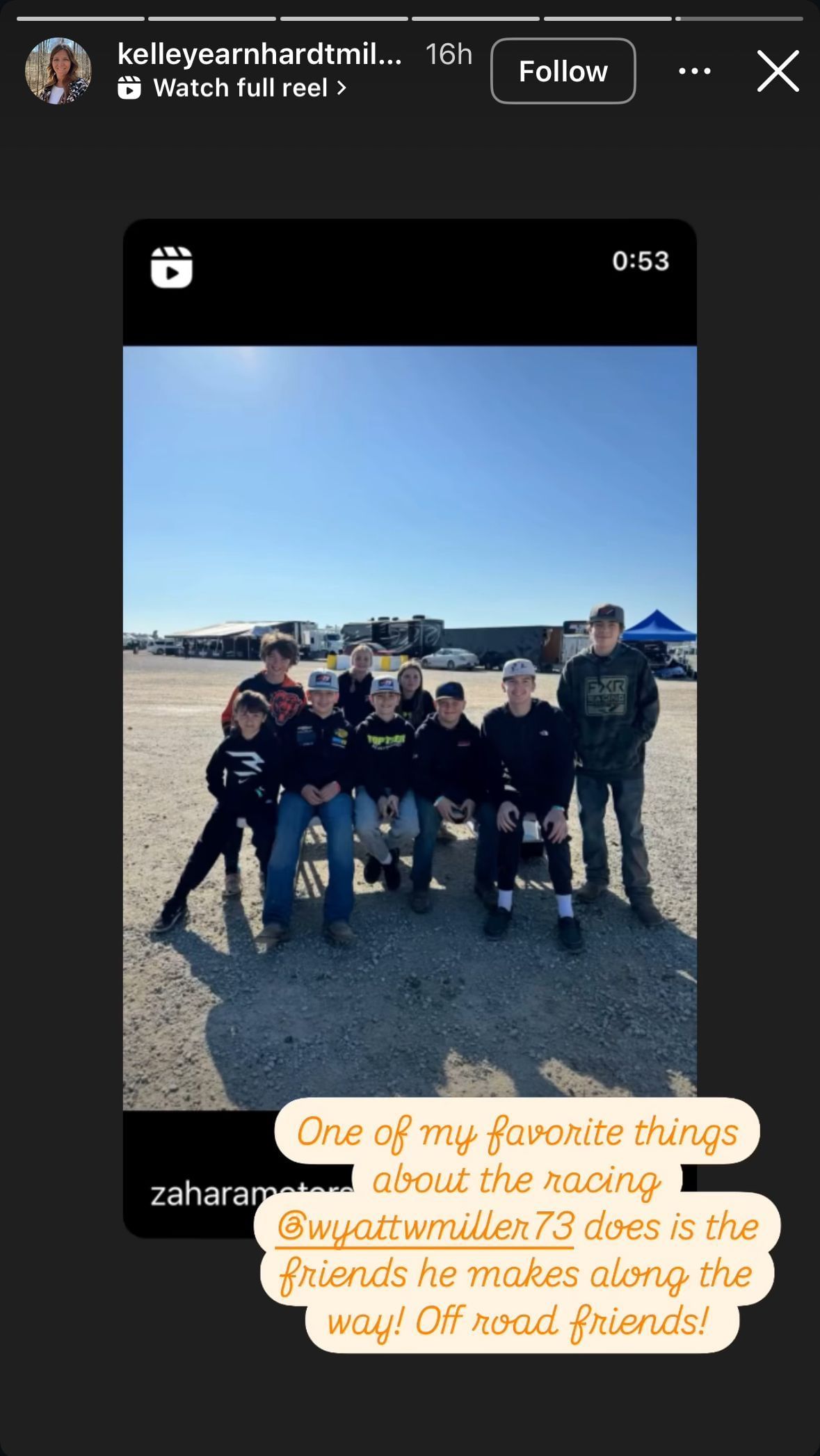 "One of my favorite things about the racing @wyattwmiller73 does is the friends he makes along the way! Off road friends!"