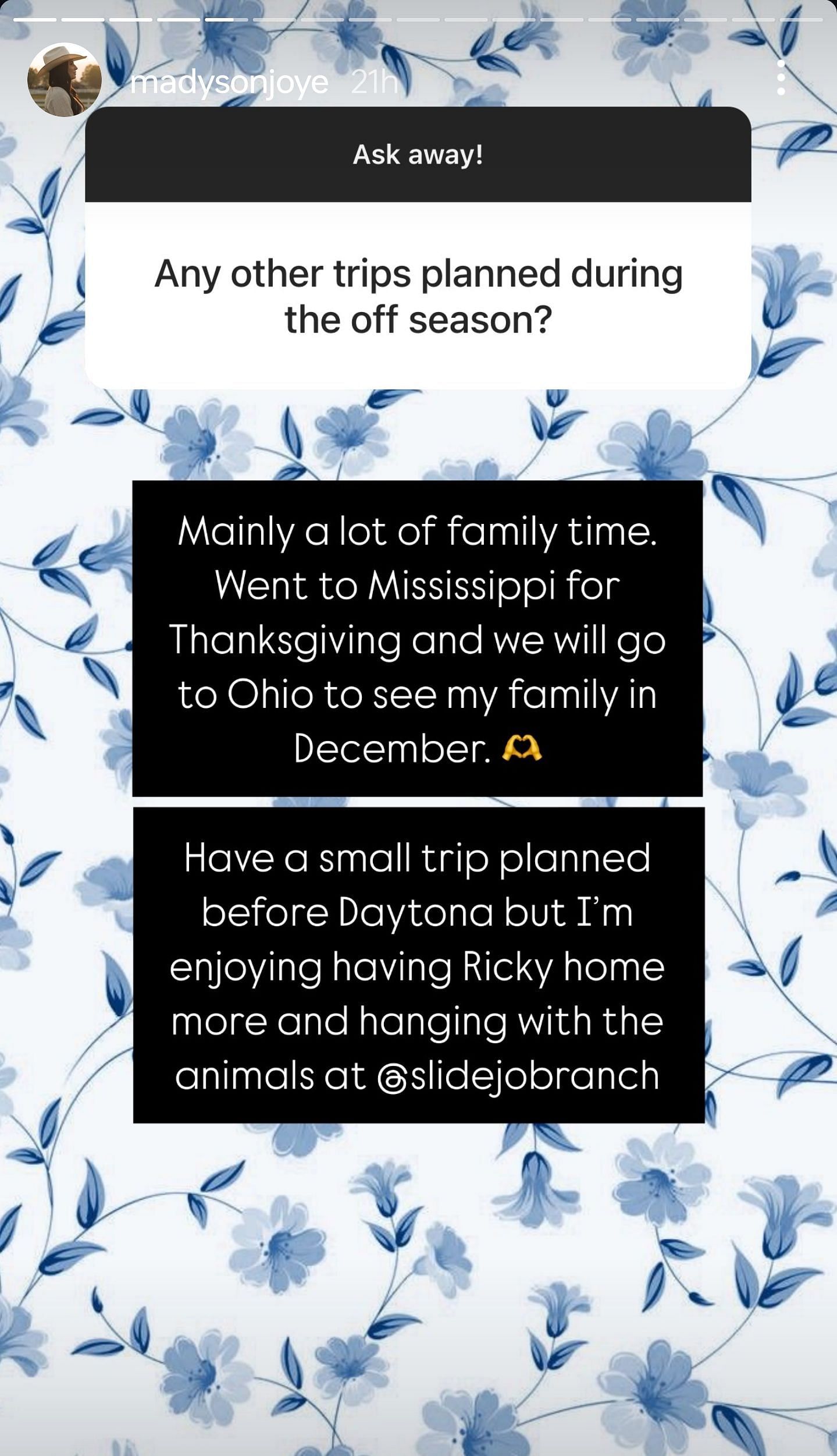 "Mainly, a lot of family time. Went to Mississippi for Thanksgiving and we will go to Ohio to see my family in December. Have a small trip planned before Daytona but I'm enjoying having Ricky home more and hanging with the animals at @slidejobranch."