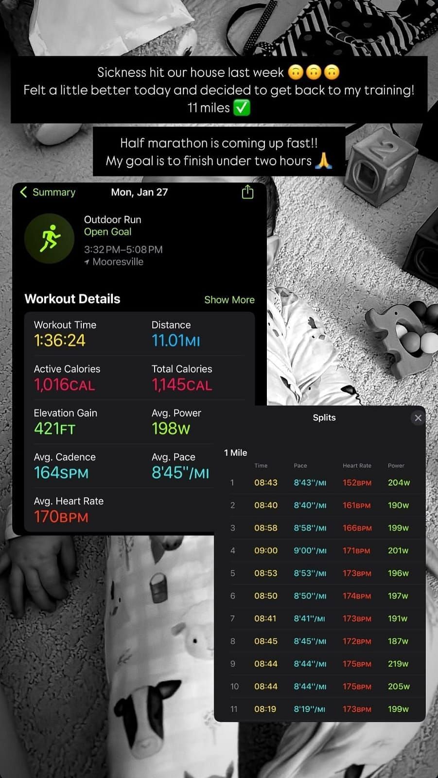 After completing 11 miles, Joye shared a summary of her workout on Monday, January 27, on her Instagram story. She began her session at 3:32 PM and wrapped it up at 5:08 PM, completing the distance in one hour and 36 minutes by maintaining an average pace of 8'45"/MI.