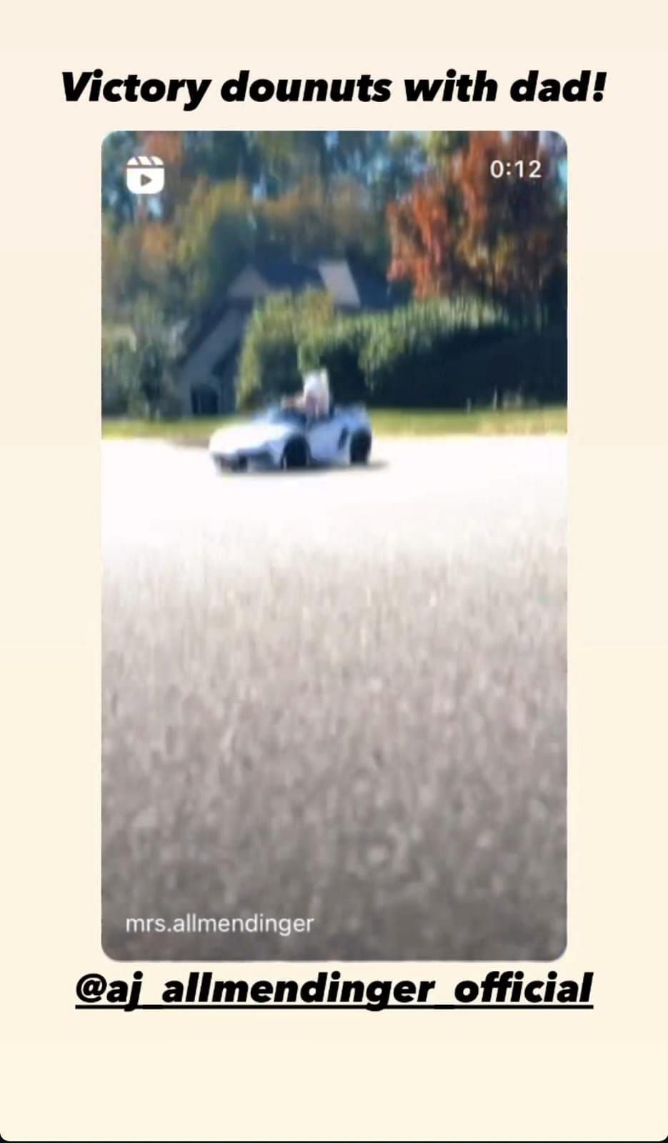 Recently, Allmendinger's wife Tara shared a story of her one-year-old son Aero James in his Lamborghini Aventador SVJ performing stunts on her Instagram. She shot the video of her son sliding into his new car and making donuts on the road with their dog in his ride. She captioned the post: