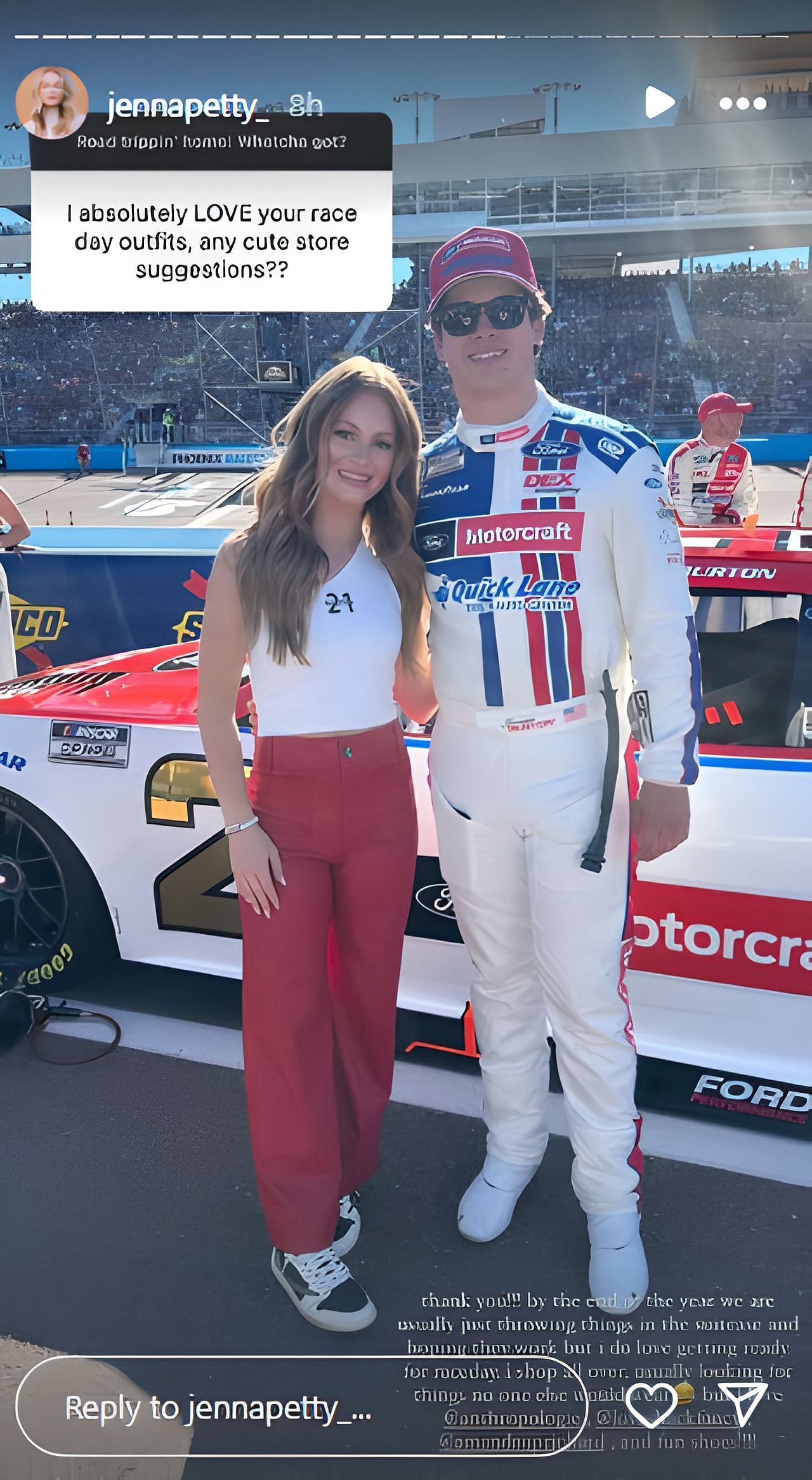 Amid her Q&A, a fan heaped praise on Harrison Burton's fiancée's race data outfit and asked for 'cute store suggestions.' Jenna replied and wrote.