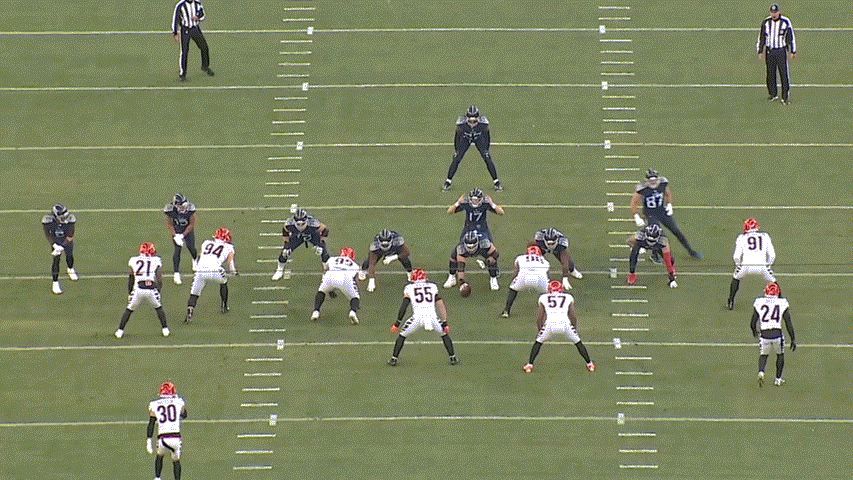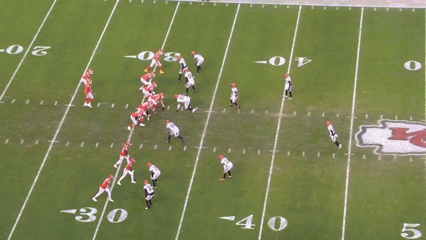 The other play we’ve seen them run a lot of – particularly against 3-4 base teams, such as Tennessee in the Divisional Round – is the crack toss, often times motioning the tight-end inside, even when he’s the No. 2 on a trips side, or having Tyler Boyd in that near-wing alignment pinning the end-man inside and somebody coming underneath the formation to get a running block on whoever is designated to replace the “edge-setter”.