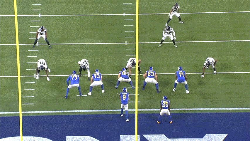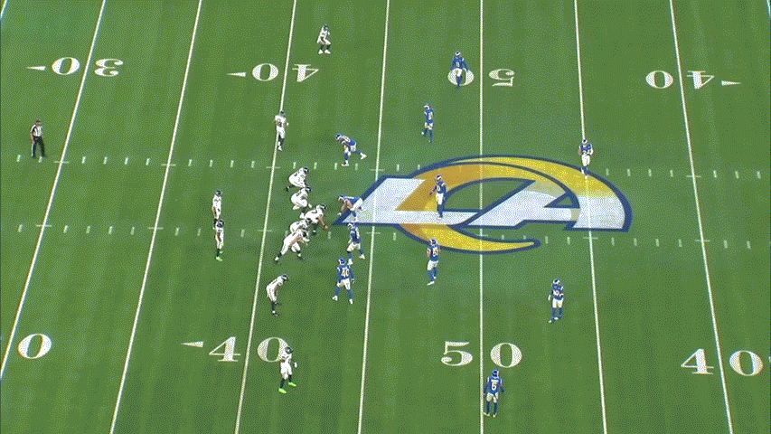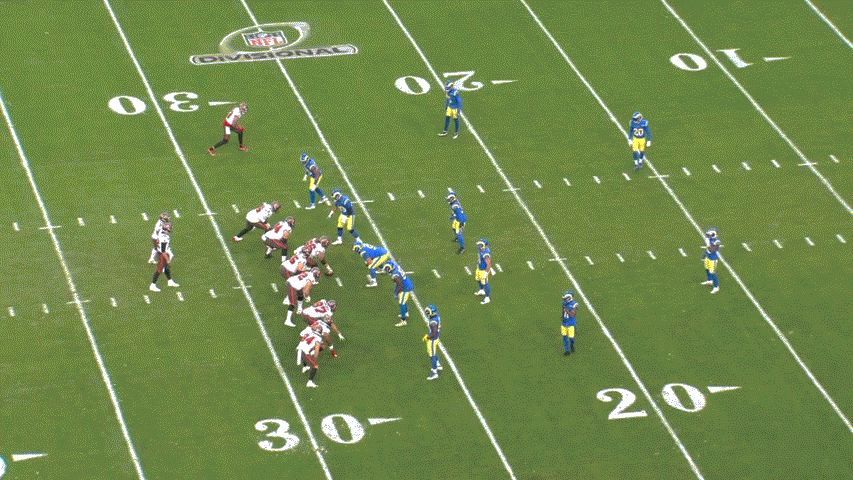 Similar to their opponents in this game, L.A. primarily runs the ball from condensed sets and under center, often times with Kupp or Ben Skowronek in a wing split almost and then use one of their other receivers on jet sweep fakes, both towards or away from the play direction. And you can’t completely discredit that as eye-candy, because they do hand it off a couple of times per game. Plus, while they don’t do it as much as typically under Sean McVay, they of course still have those misdirection bootlegs or waggles with levels, where Stafford’s big arm also enables them to take those shots down the post from the backside, if the opposing safeties become undisciplined. On those boots, a lot of times they’ll have the backside edge-sealer (Kupp and others) sit down after the QB gets outside and Stafford has the flexible arm to pop it up to them, where they usually have some green grass in front, as the front-side flows and the back-side tries its hustle outside, against that misdirection stuff.