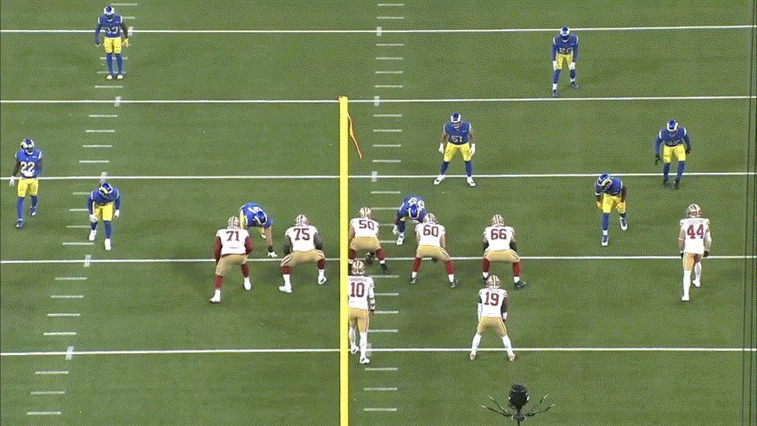 When the Rams do hand it from shotgun it’s mostly inside the zone, where Stafford doesn’t usually have the option to pull the ball (which might be a change-up in this contest) and they’re not much of an RPO team. It’s more so screen alerts to sdegreeree, when they have leverage on the linebacker versus the number three in trips and he doesn’t flow that way off the snap. Those quick inside-hitting runs have been especially effective towards the weak-side against even front teams, when they were in a 3-1 alignment with their defensive tackles towards the field.