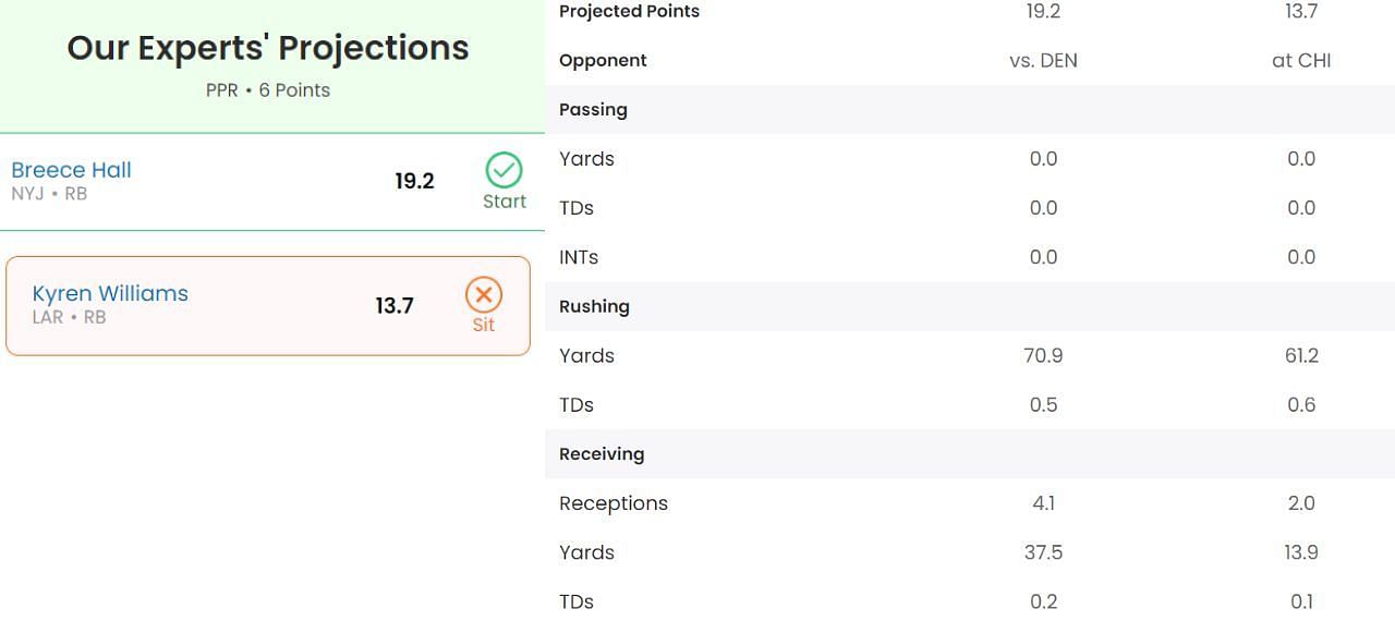 Sportskeeda's Start/Sit analyzer has Breece Hall scoring 5.5 points more than Kyren Williams this week. The projected stats can be seen in the image below:
