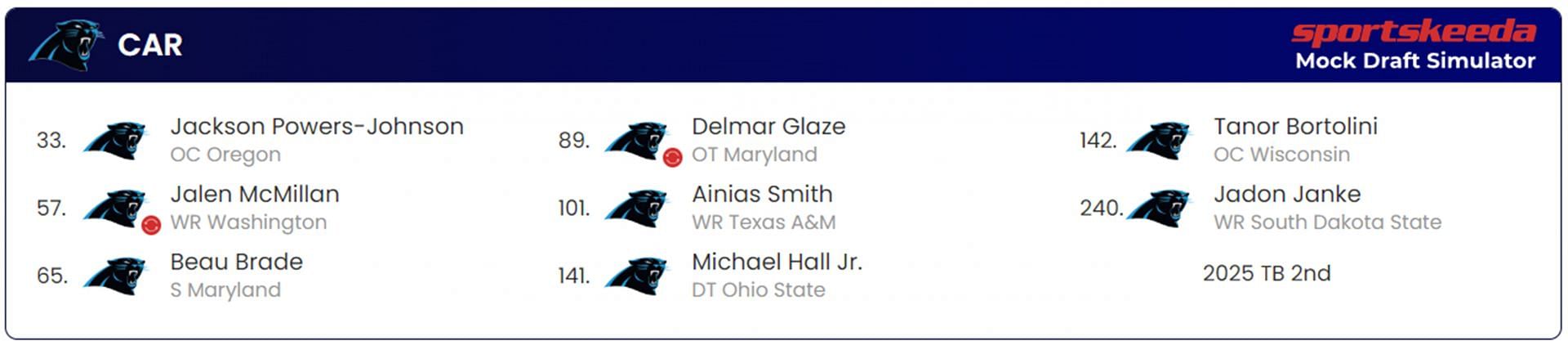 They address Bryce Young's receiving needs with the first two picks, choosing a wide receiver and a tight end. Then they get to solidifying the porous offensive line by adding an offensive tackle, before moving to draft an edge rusher on defense. To ensure the highest chance of success, Carolina then picks another offensive tackle, center, and wide receiver in the later rounds, while also adding another edge rusher and a cornerback.