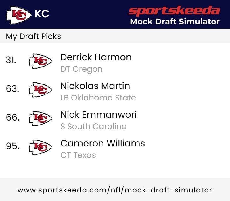 Our Sportskeeda Mock Draft Simulator has Kansas City addressing the defense with their first-round pick. After Tershawn Wharton left in free agency, signing a $18 million-per-year deal with the Carolina Panthers, the team acted swiftly to find his replacement, picking Oregon's Derrick Harmon at the end of the first round: