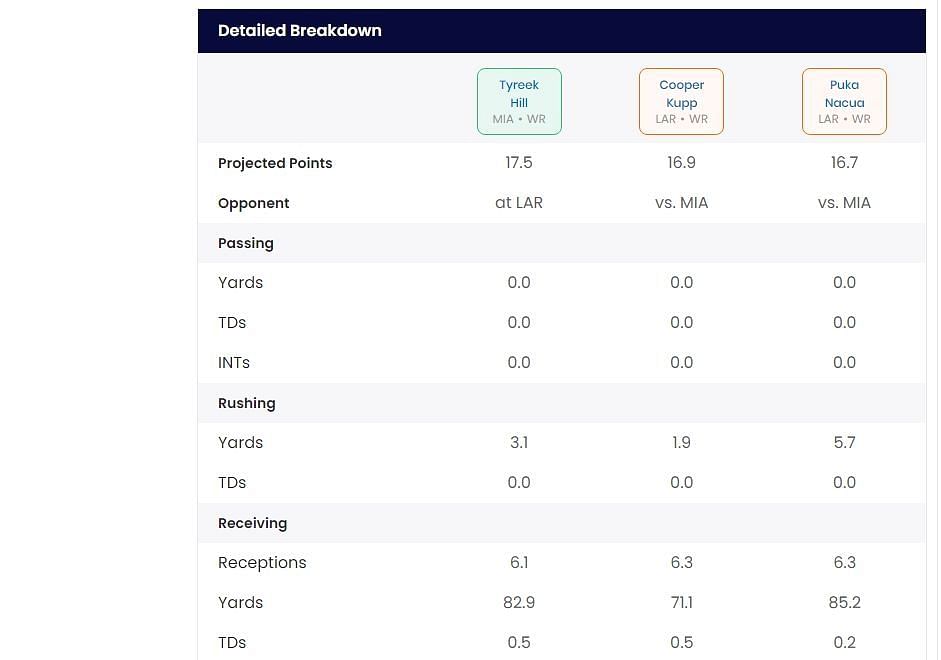 Sportskeeda's Who Should I Start tool predicts that the three options will turn in similar production this week, with Hill projected to outscore Nacua and Kupp by less than a point each in PPR scoring. His superior projections in total yardage and likelihood of scoring a TD this week are the main reasons why he is the preferred pick.