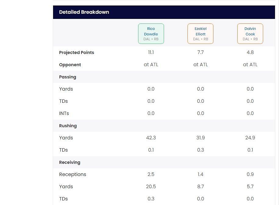 Sportskeeda's Who Should I Start tool predicts that Dowdle will score three more fantasy points than Elliot and six more than Cook. He is the safest option, although all three carry dangerous weekly floors.