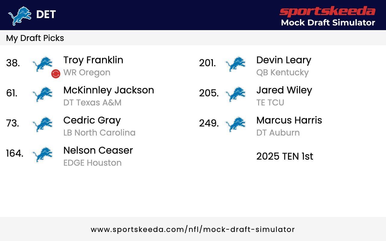 To trade down nine spots, the Tennessee Titans called and offered their second-rounder and their 2025 first-rounder. With that pick, the Lions took Troy Franklin to once again address the wide receiver need.