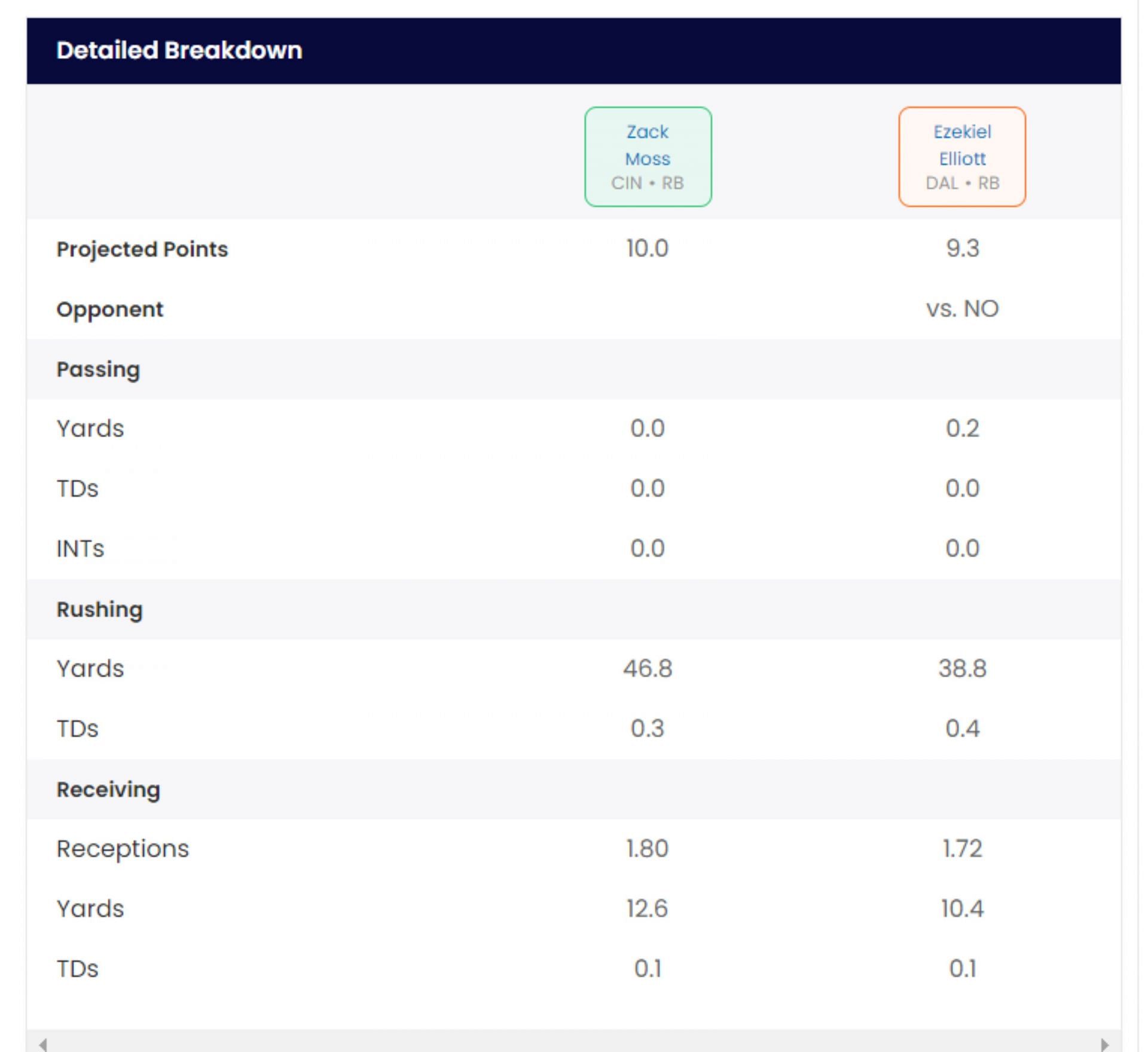 According to our Sportskeeda Start/Sit Optimizer, Zack Moss is the right pick over Ezekiel Elliott. The Bengals have a special relationship with the Chiefs, which would prompt them to play at a higher level this weekend. Moss is due a big game and this could be the right opportunity to make fans forget Joe Mixon.