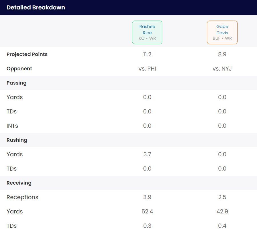 Lamb torched Philly for 30.1 fantasy points before its Week 10 bye. While no one should expect Rice to match that performance, players such as Jahan Dotson and Kendrick Bourne scored nearly 25 versus the Eagles with quarterbacks much less talented than Patrick Mahomes. At worst, Rice should be considered a high-upside WR3 choice this week for Monday Night Football.