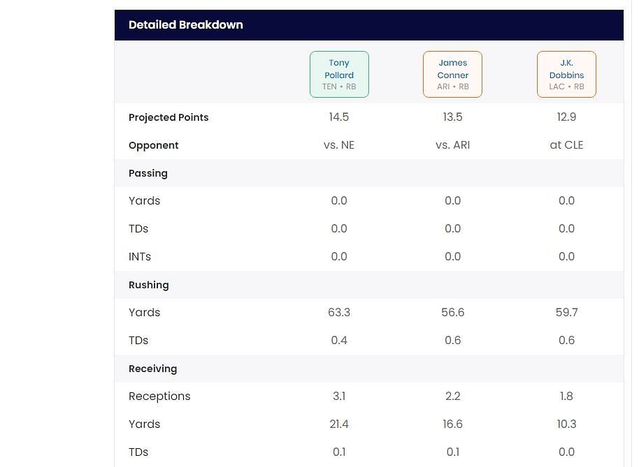 Sportskeeda's Who Should I Start tool expects Pollard to score more than an additional fantasy point than Conner and Dobbins in PPR formats this week. His projected involvement as a receiver, as well as his overall yardage projections, are among the main reasons for him being the preferred pick.