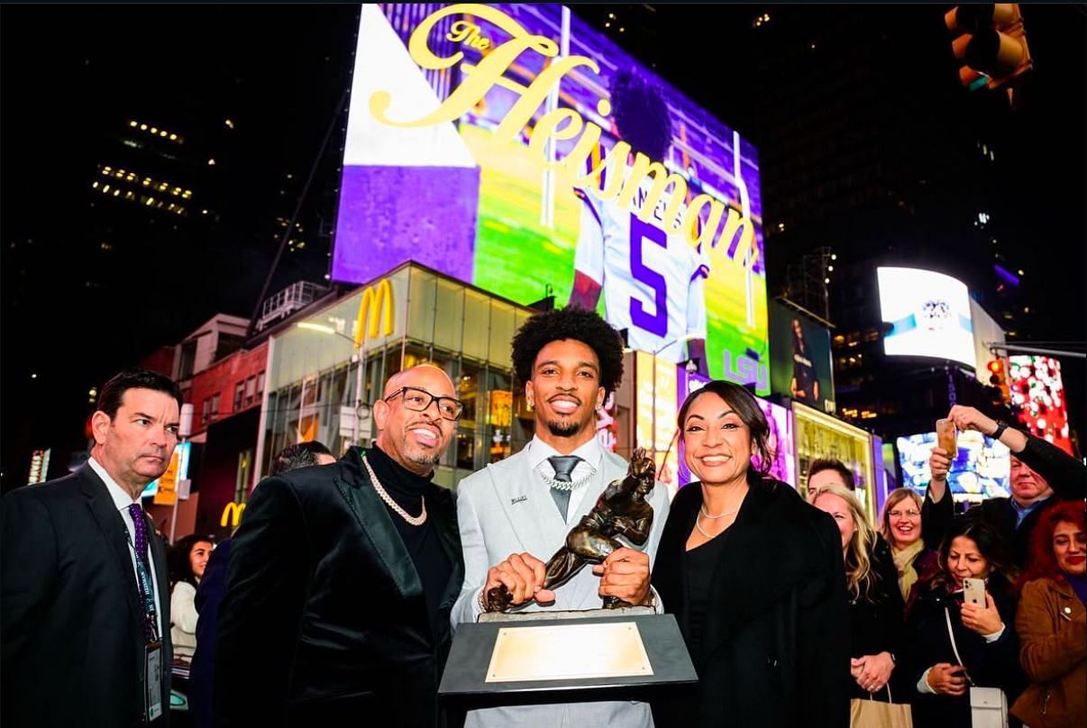 Jayden Daniels’ was born to Javon Daniels and Regina Jackson on December 18, 2000. The People reports that the two met while they were teenagers and went to Cajon High School, where their son would eventually go. Javon and Regina are often spotted in the stands supporting their son. The quarterback gave a heartfelt shout-out to his father after accepting the 2023 Heisman Trophy