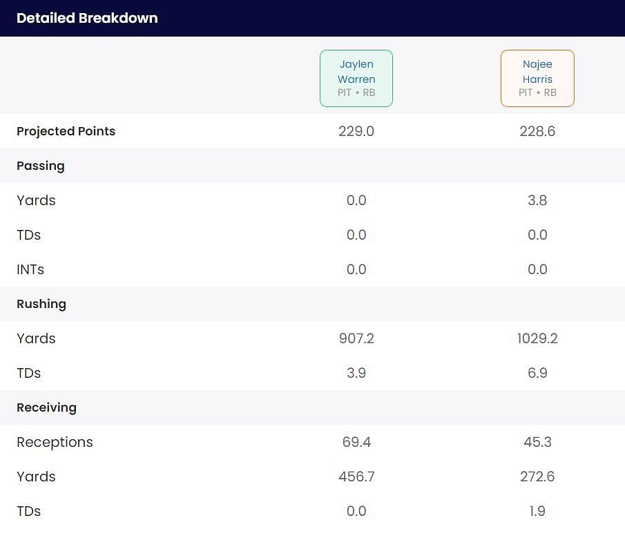 According to Sportskeeda's fantasy draft calculator, Warren is in line for a decent level of production this year. However, managers will only wonder what it could have been had Najee Harris not been in the picture this year. Warren is due to earn about 900 yards and four touchdowns on the ground and 450 yards through the air on 70 receptions.