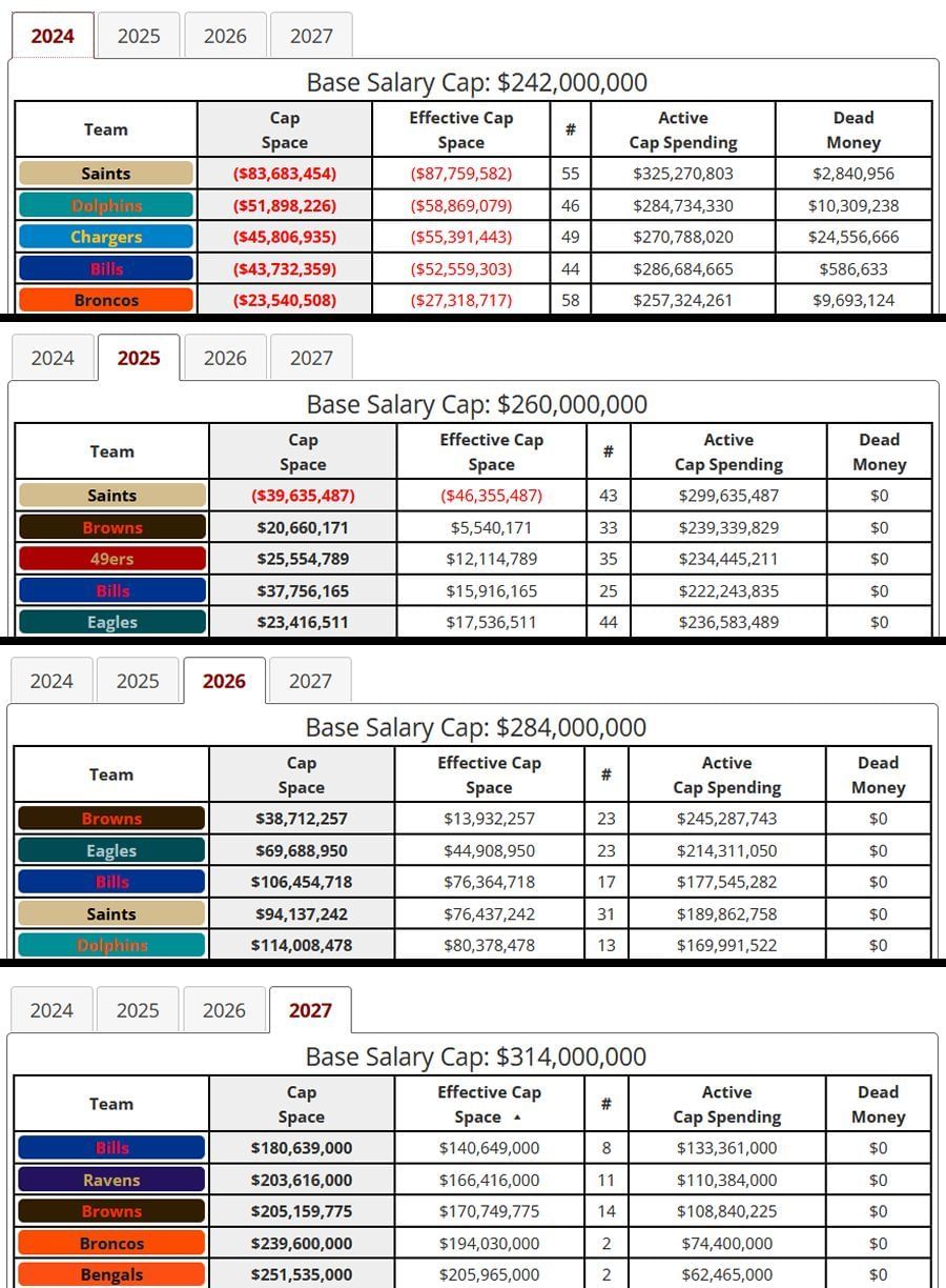 According to OverTheCap.com, Buffalo is projected to be 29th or worse in effective cap space each of the next four seasons, in large part because Josh Allen’s cap hit goes from $18.6 million in 2023 to an average of $48.5 million per year over the five seasons remaining on his contract extension – and deservedly so.