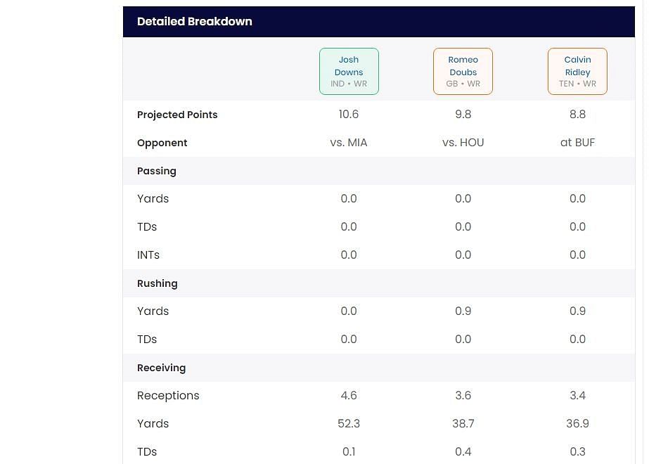 Sportskeeda's Who Should I Start tool predicts that Downs will have more recpetions and yards than Ridley and Doubs this week. This is enough to make him the recommended pick, despite him being the least likely of the trio to score a touchdown.