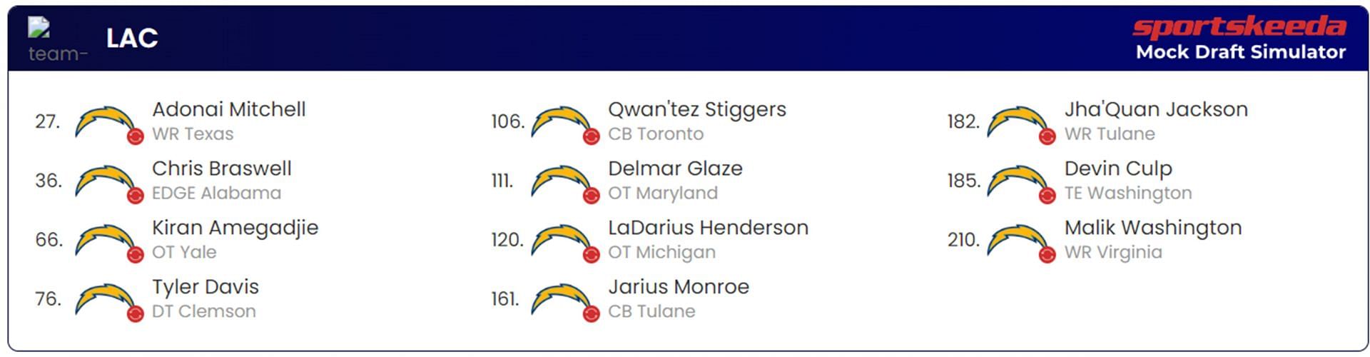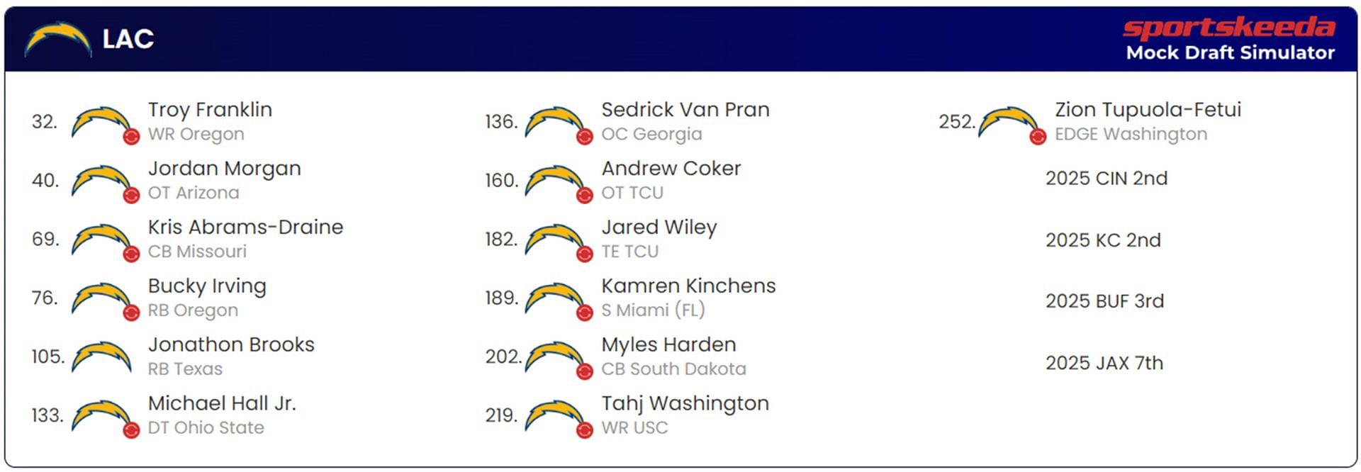 With the next two picks, they need to retool the offensive line and could pick a couple of offensive tackles before choosing a defensive tackle later in the draft. In the later rounds, they could add depth to Justin Herbert's weapons by drafting more wide receivers and tight ends and also get some help on the defensive side with a pass rusher.